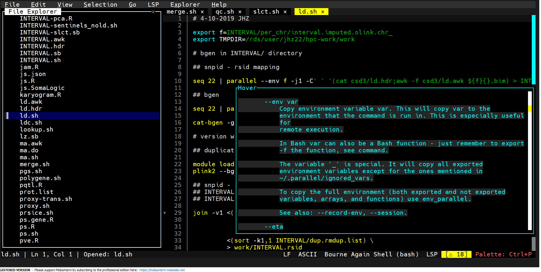 Simiarly, we make bash-language-server as well as markdown-language-server available so ~/.config/settings.json becomes,